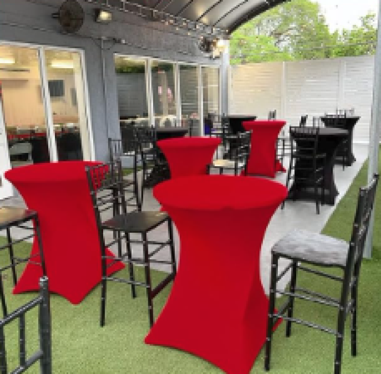 This festive Red Spandex Table Cover pairs with our High-Top Cocktail table to provide a modern aesthetic for the perfect elegant evening.